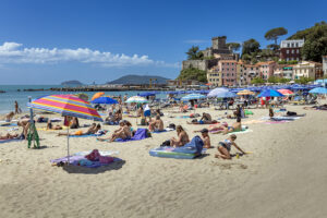 Het strand en op de achtergrond het kasteel van San Terenzo