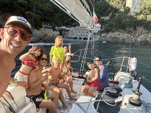 Eenmaal aangemeerd neemt Matteo de controle over. Als hobbykok tovert hij een heerlijke aperitivo en fles bubbels tevoorschijn. De wijn draagt bij aan verdraagzaamheid en het lijkt plots niet zo’n uitdaging meer om met z’n negenen in een boot van amper dertien meter te slapen. Na een zacht wiegende nachtrust en een ochtendwandeling in de smalle straten van Porto Venere varen we weer richting vertrekpunt Lavagna. Bij het afscheid spreken we af dat Franco mij kan bellen als er bij een regatta nog een bemanningslid nodig is. Dit zeiltochtje smaakt naar meer. •